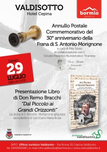 ANNULLO-low ANNULLO-low 29 luglio – Annullo Francobollo Commemorativo e Presentazione Libro – Posted by Valdisotto Tourism on 13 Luglio 2017 in 0 Commenti Condividi questo articolo: informazioni su Valdisotto Tourism 0 Commenti Lascia una risposta Clicca qui per annullare la rispostaDevi accedere per inserire un commento.