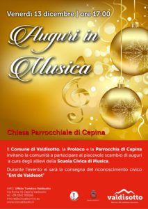 Il Comune, la ProLoco e la Parrocchia di Cepina invitano la comunità a partecipare al piacevole scambio di auguri a cura degli allievi della Scuola Civica di Musica.
