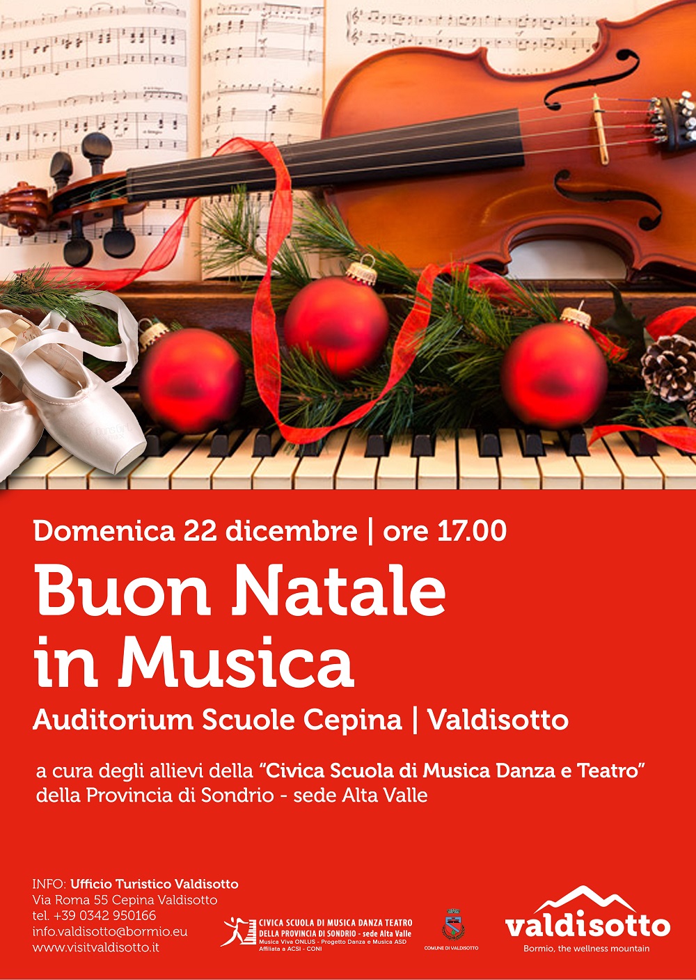 La Civica Scuola di Musica Danza Teatro della Provincia di Sondrio sezione Alta Valle organizza “Buon Natale in Musica” presso l’Auditorium di Cepina domenica 22 dicembre alle ore 17:00.