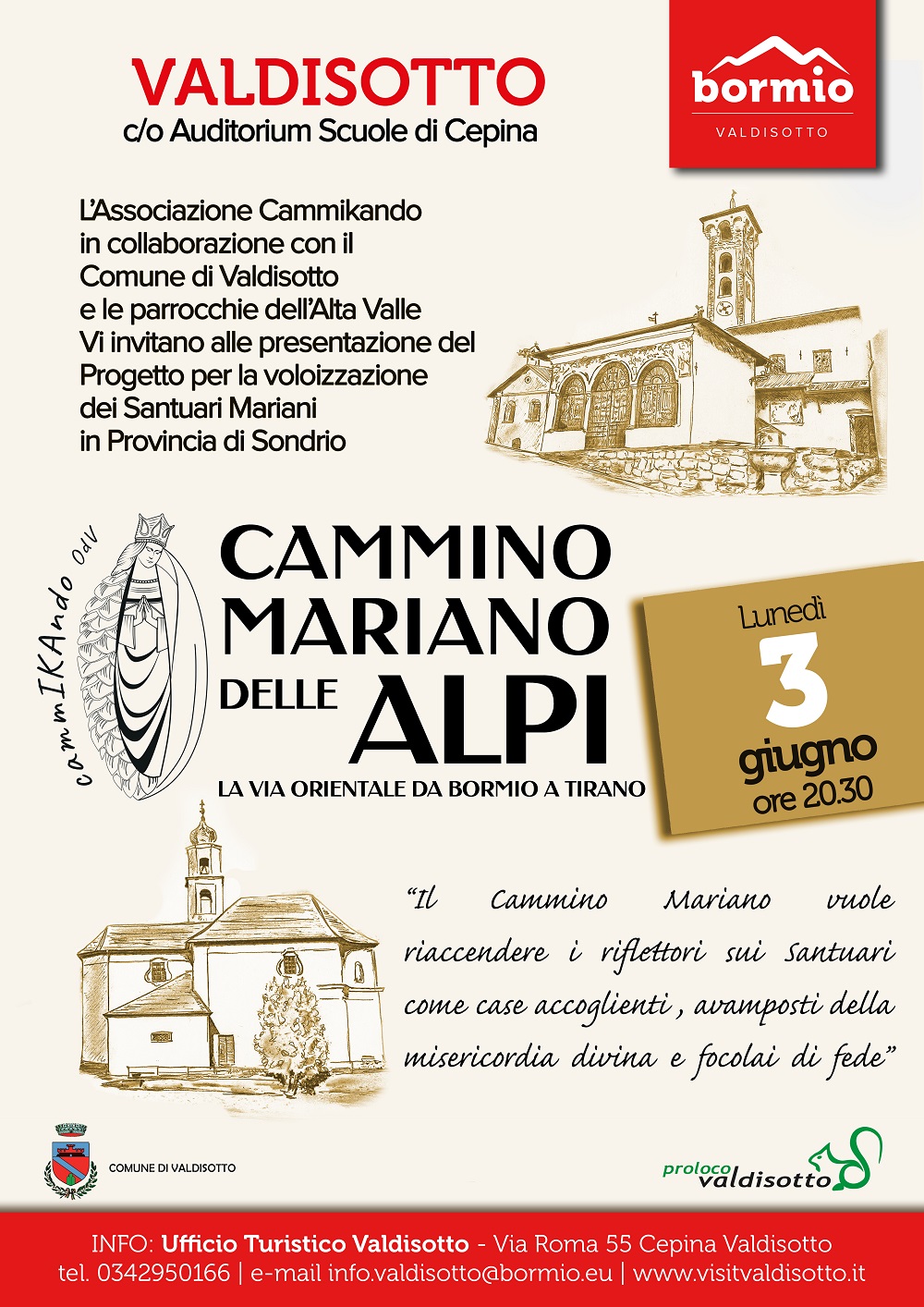 L’Associazione cammIKAndo OdV in collaborazione con il Comune di Valdisotto – Lombardia e Valdisotto Turismo nonché le Parrocchie dell’Alta Valle ti invitano alla presentazione del Progetto per la valorizzazione dei Santuari Mariani in Provincia di Sondrio denonato: “CAMMINO MARIANO DELLE ALPI – La Via Orientale da Bormio a Tirano”.