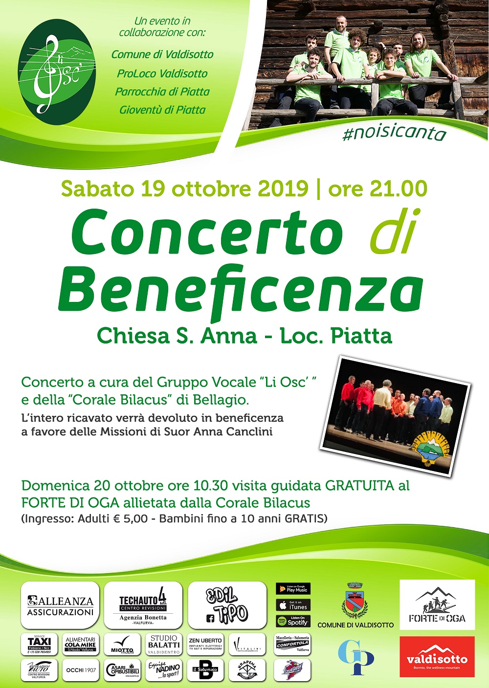 Concerto di Beneficenza – Chiesa S. Anna Piatta – 19 ottobre 2019 Concerto di Beneficenza – Chiesa S. Anna Piatta – 19 ottobre 2019 Visita Guidata GRATUITA al Forte di Oga allietata da Corale Bilacus 1^ Raduno Auto Bormio 2000 – notturna 7 settembre 2019 Posted by Valdisotto Tourism on 18 Settembre 2019 in Eventi passati 0 Commenti Concerto di Beneficenza a cura del gruppo vocale “Li Òsc’ ” e della “Corale Bilacus” di Bellagio presso la Chiesa St. Anna di Piatta ore 21.00. ENTRATA LIBERA. L’intero ricavato verrà devoluto in beneficenza a favore delle missioni di Suor Anna Canclini che opera in Calabria. Condividi questo articolo: informazioni su Valdisotto Tourism Articoli correlati 25 agosto – 2 settembre – Torneo Serale a Coppie di CALCIOBALILLA 40° Torneo delle Frazioni Laboratori Collettivi di Primavera Il soldatino OGHINO 0 Commenti Lascia una risposta Clicca qui per annullare la rispostaDevi accedere per inserire un commento.