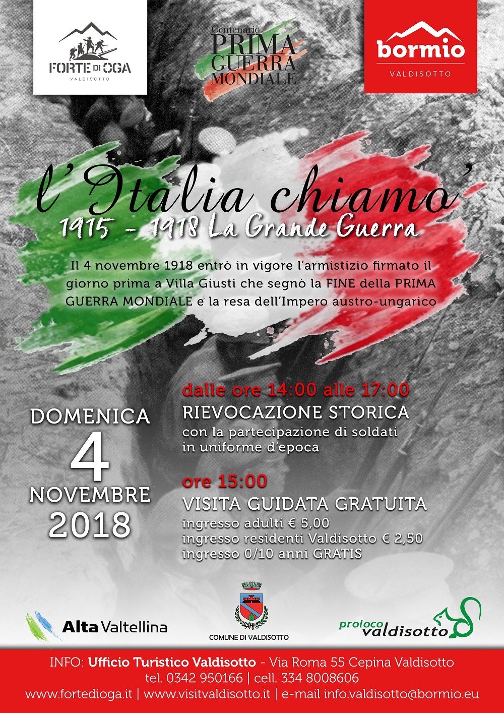 A 100 anni da questa data importante, al Forte di Oga il 4 novembre 2018, grazie alla partecipazione di alcuni soldati (comparse) in uniforme d’epoca si terrà una piccola rievocazione storica (dalle 14.00 alle 17.00).