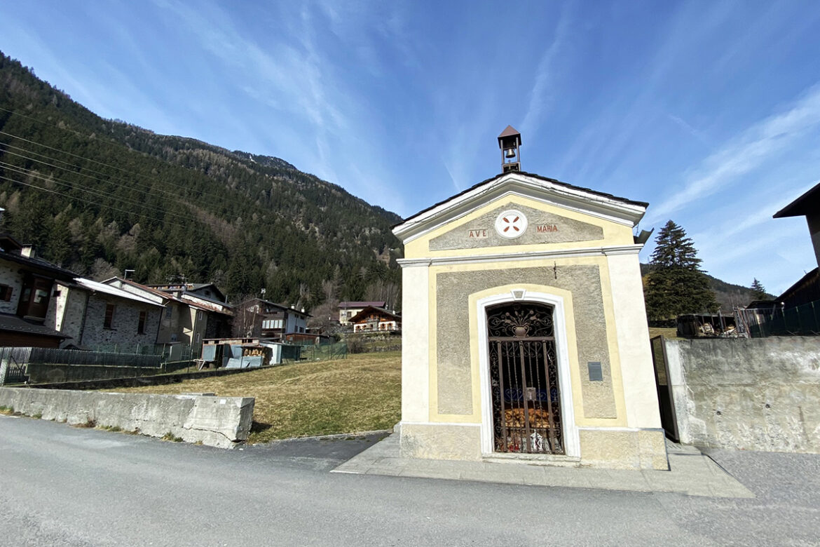 Chapel dedicated to the Virgin of the Rosary at the intersection of Via Pedemonte and Via Scleva in Cepina. It was built around 1843 after a landslide event of the Valècia, replacing a previous one dating back to the 16th century. The original wooden statue of the Madonna, dating back to the 17th century, is kept in the parish church of Cepina. It has various outfits that match the different times of the liturgical year, and for many years it was housed in the home of Bracchi Camilla in Pedemonte. In earlier times, there was another statue of the Virgin in a small wooden shrine about 30 cm high, now kept in a house in the hamlet.
